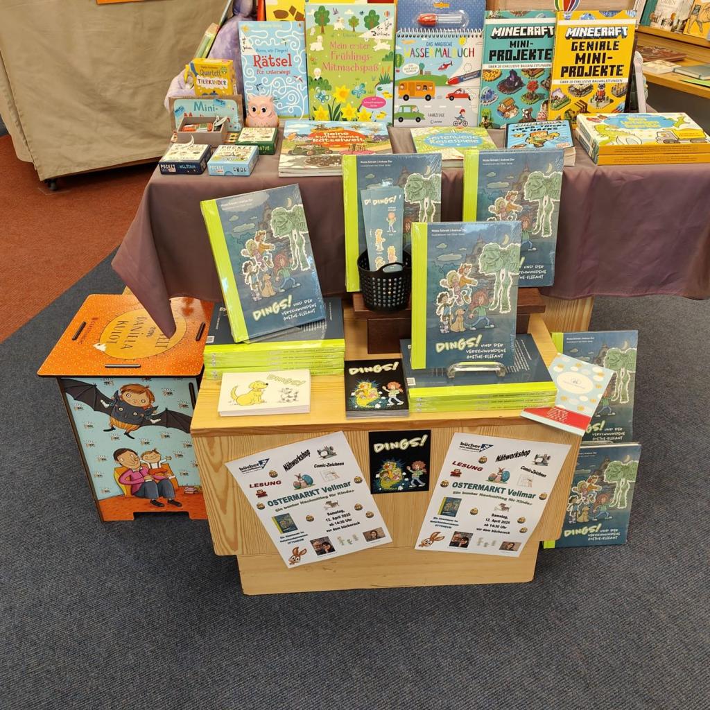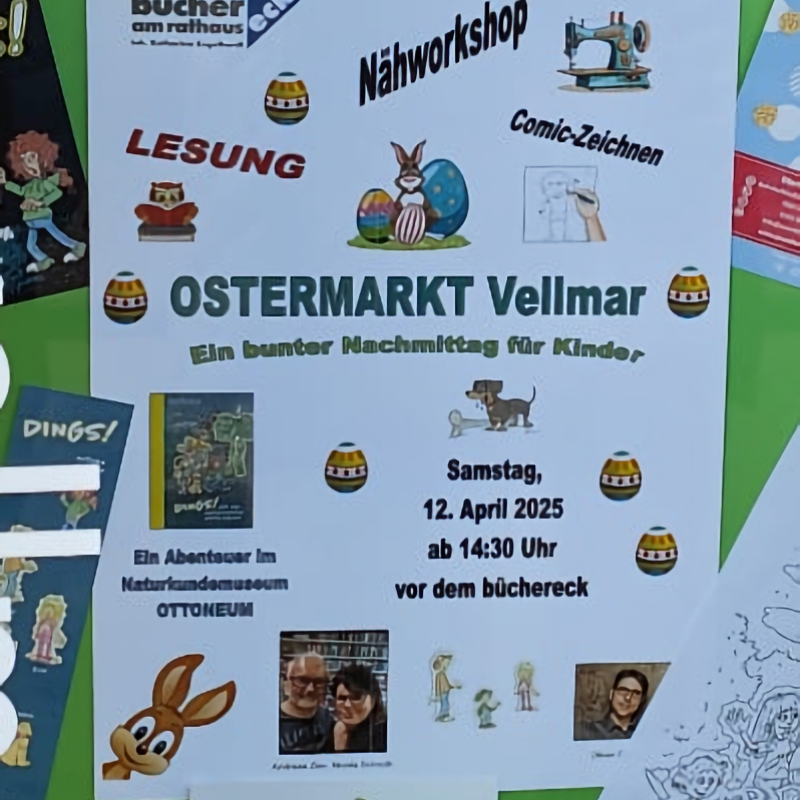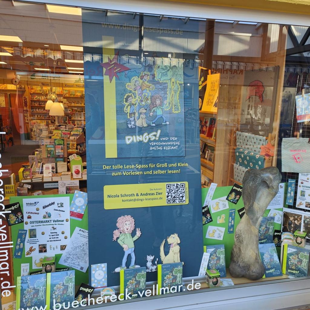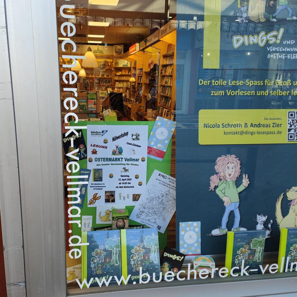 Wir danken Inhaberin Katharina Engelhardt und ihrem Team vom Büchereck ganz herzlich für diese tolle Möglichkeit, uns bereits vor unserer Lesung im Rahmen des Ostermarktes Vellmar am 12.04.2025 präsentieren zu können. An diesem Tag werden Nicola Schroth und Andreas Zier dann für alle Interessierten aus dem Buch lesen und unser Illustrator Oliver Gerke wird zeigen, wie er die Bilder zum Buch und Comics zeichnet.