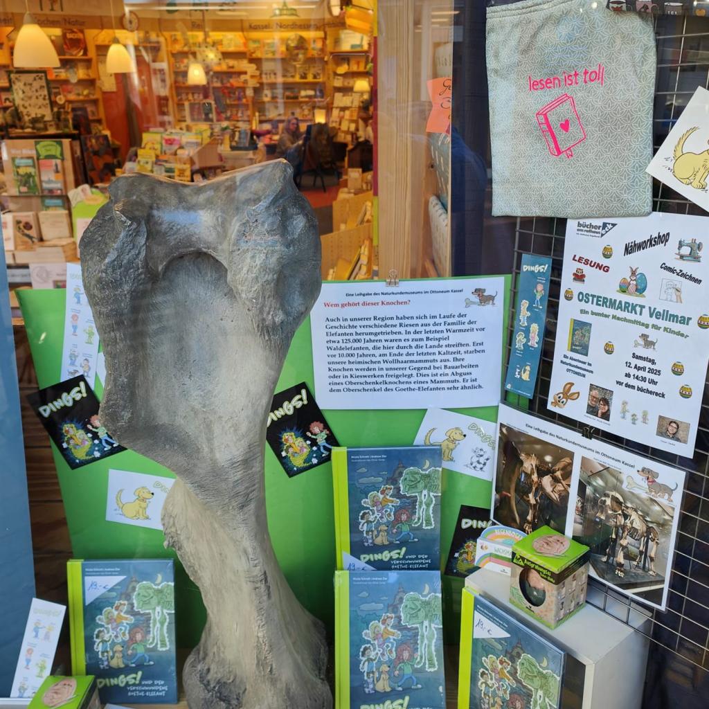 Übrigens, der Knochen (Nachbildung) im Schaufenster ist eine freundliche Leihgabe vom Naturkundemuseum Kassel (Ottoneum), das in unserer Geschichte eine wesentliche Rolle spielt.